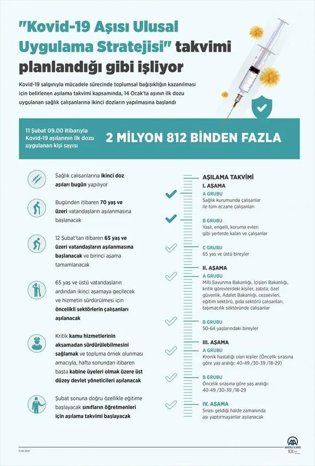 Çin'den 30 Aralık 2020'de Türkiye'ye getirilen ve 13 Ocak'ta "Acil Kullanım Onayı" verilen CoronaVac aşısı, "Kovid-19 Aşısı Ulusal Uygulama Stratejisi" doğrultusunda ilk olarak 14 Ocak'ta sağlık çalışanlarına uygulandı. Sağlık çalışanlarının ardından öncelikli gruptaki vatandaşların aşılanması sürecine geçildi.
