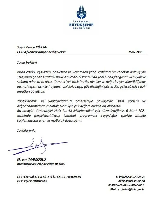 Sayın Vekilim, İnsan odaklı, eşitlikten, adaletten ve üretimden yana, katılımcı bir yönetim anlayışıyla 18 ayımızı geride bıraktık. Bu kısa sürede, "İstanbul'da yeni bir başlangıcın" ilk büyük ve sağlam adımlarını attık. Cumhuriyet Halk Partisi'nin ilke ve değerleriyle yönetildiğinde bu muhteşem kentte hayatın nasıl kolaylaşıp güzelleştiğini gösterdik, geleceğimize dair umutları büyüttük. Yaptıklarımızı ve yapacaklarımızı örnekleriyle paylaşmak, sizin gözlem ve değerlendirmelerinizi almak bizim için çok değerli bir kılavuz olacaktır. Bu amaçla, Cumhuriyet Halk Partisi Milletvekilleri için düzenlediğimiz, 6 Mart 2021 tarihinde gerçekleştirilecek İstanbul programına saygıdeğer eşinizle birlikte katılımınızdan onur ve mutluluk duyacağım.