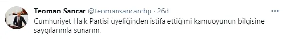 CHP Denizli Milletvekili Teoman Sancar, "Cumhuriyet Halk Partisi üyeliğinden istifa ettiğimi kamuoyunun bilgisine saygılarımla sunarım" sözleriyle partisinden istifa ettiğini duyurdu.