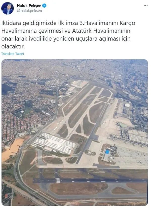 "İktidara geldiğimizde ilk imza, 3'üncü Havalimanı'nı Kargo Havalimanı'na çevirmesi ve Atatürk Havalimanı'nın onarılarak ivedilikle yeniden uçuşlara açılması için olacaktır."
