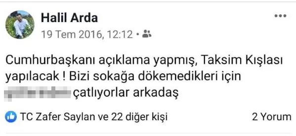 19 Temmuz 2016: "Cumhurbaşkanı açıklama yapmış, Taksim Kışlası yapılacak! Bizi sokağa dökemedikleri için …lerinden çatlıyorlar arkadaş"