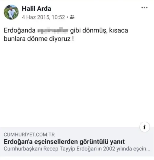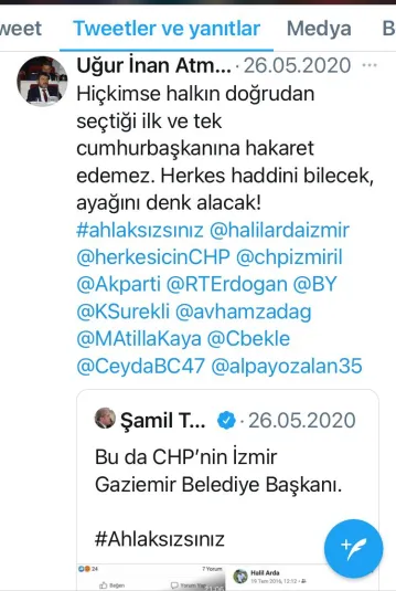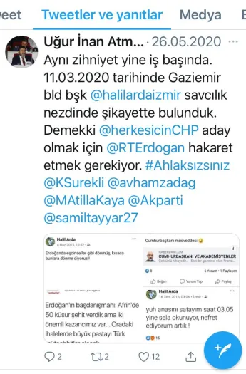 "Facebook adresindeki Uğur İnan Atmaca'nın 26 Mayıs 2020 tarihlive 21.57 zaman dilimindeki paylaşımları incelendiğinde ayrıntıları raporda belirtildiği üzere, Dila @Dilakoyurga rumuzlu gözüken kullanıcı ve Halil Arda isimli kullanıcının paylaşım ekran görüntülerinde yazılan içeriklere sinirlenerek, bu içeriklerin ekran görüntülerini paylaşarak bu görüntülerin altına, Uğur İnan Atmaca @uginat isimli twitter kullanıcı profil hesabının profil sayfasında herkese açık olan ekran görüntüsünde, 26 Mayıs 2020 tarihinde, "Aynı zihniyet işbaşında" 11/03/2020 tarihinde Gaziemir Belediye Başkanı Halil Arda İzmir savcılık nezninde şikayette bulunduk. Demek ki @herkesiçin CHP'de aday olmak için @RTErdoğan RECEP Tayyip Erdoğan'a hakaret etmek gerekiyor.#Ahlaksızsınız @KSUREKLİ@AVHAMZADAĞ@MatillaKaya@Akparti@samiltayyar27" şeklinde paylaşımında bulunduğu…"