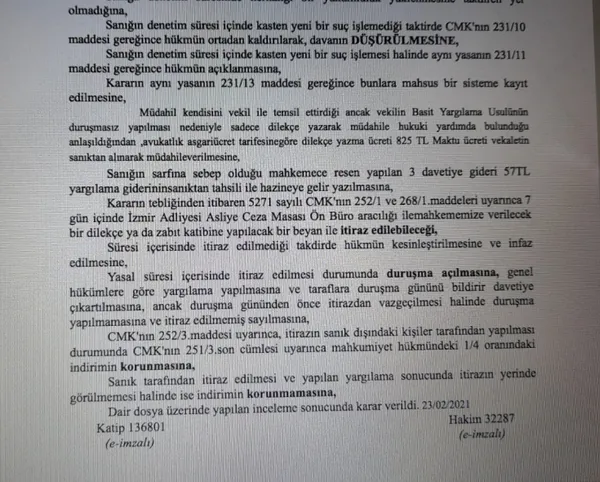 İzmir 36. Asliye Ceza Mahkemesi; Uğur İnan Atmaca'nın 186 gün adli para cezasına çarptırdı. Mahkeme; Atmaca'nın 5 yıl denetime tabi tutulmasına hükmetti.