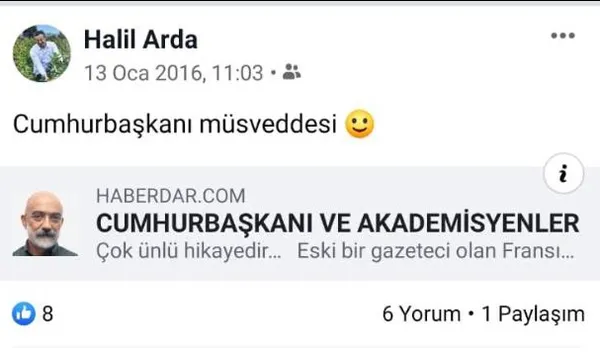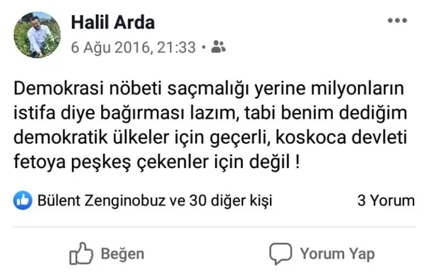 Gaziemir Belediye Başkanı Halil Arda'nın Başkan Erdoğan ve 15 Temmuz darbe girişimini eleştirdiği paylaşımları şöyle: