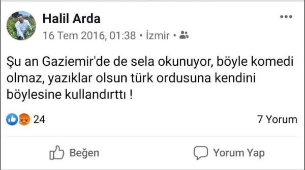 16 Temmuz 2016: "Şu an Gaziemir'de de selalar okunuyor. Böyle komedi olmaz. Yazıklar olsun. Türk ordusuna kendini böylesine kullandırttı"