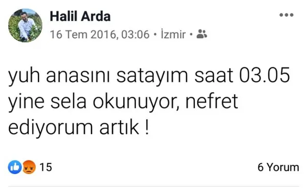 16 Temmuz 2016: "Yuh anasını satayım saat:03.05 yine sela okunuyor. Nefret ediyorum artık!"