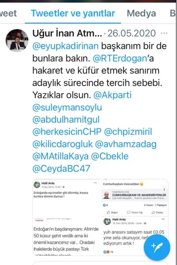 26 Mayıs 2020: "Eyyüp Kadir İnan başkanım bir de bunlara bakın. Recep Tayyip Erdoğan'a hakaret ve küfür etmek sanırım adaylık sürecinde tercih sebebi. Yazıklar olsun"