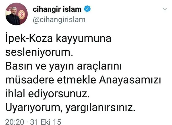 "15 Temmuz bâtıl ile bâtılın çatışmasıydı" diyerek 15 Temmuz şehit ve gazilerimize saygısızlık eden Saadet Partisi milletvekili Cihangir İslam Fetöcü Koza İpek'e atanan kayyumları "yargılanırsınız" diye tehdit etmiş 2015'te.