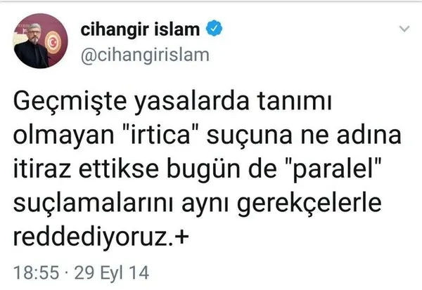 "15 Temmuz bâtıl ile bâtılın çatışmasıydı" diyerek 15 Temmuz şehit ve gazilerimize saygısızlık eden milletvekili Cihangir İslam, 2014'te Ahmet Şık'ın "cemaatin yaşadığı faşizmdir" ifadesini paylaşmış.