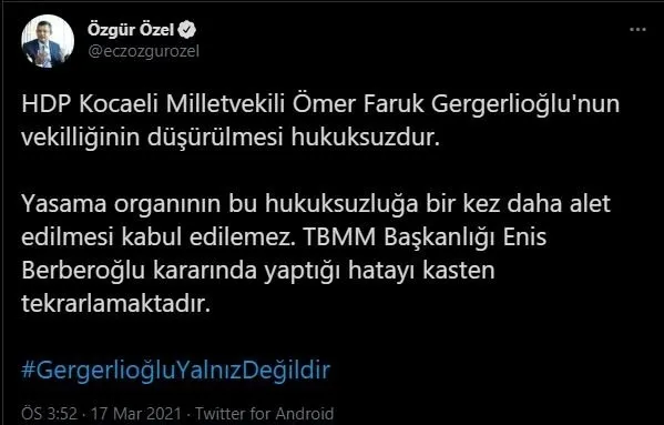 HDP Kocaeli Milletvekili Ömer Faruk Gergerlioğlu'nun vekilliğinin düşürülmesi hukuksuzdur.