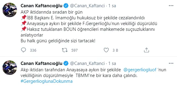 Gergerlioğlu'nun vekilliğinin düşürülmesine ilk ses DHKP-C sempatizanı Canan Kaftancıoğlu'ndan geldi. Kaftancıoğlu, "Akp iktidarı tarafından Anayasaya aykırı bir şekilde@gergerliogluof 'nun vekilliğinin düşürülmesiyle TBMM'ne bir kara daha çalındı. #GergerlioglunaDokunma AKP iktidarında sıradan bir gün. İBB Başkanı E. İmamoğlu hukuksuz bir şekilde cezalandırıldı Anayasaya aykırı bir şekilde F.Gergerlioğlu'nun vekilliği düşürüldü Haksız tutuklanan BOUN öğrencileri mahkemede suçsuzluklarını anlatıyorlar Bu halk günü geldiğinde sizi tartacak!" dedi.