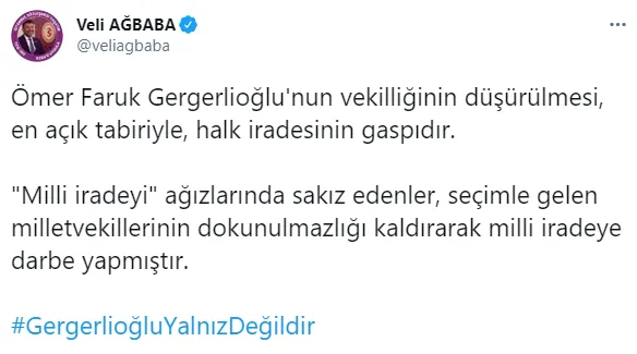 Meclis'e YPG'li teröristi getirmesiyle tanına CHP'li Veli Ağbaba ise "Ömer Faruk Gergerlioğlu'nun vekilliğinin düşürülmesi, en açık tabiriyle, halk iradesinin gaspıdır. "Milli iradeyi" ağızlarında sakız edenler, seçimle gelen milletvekillerinin dokunulmazlığı kaldırarak milli iradeye darbe yapmıştır. #GergerlioğluYalnızDeğildir" dedi.