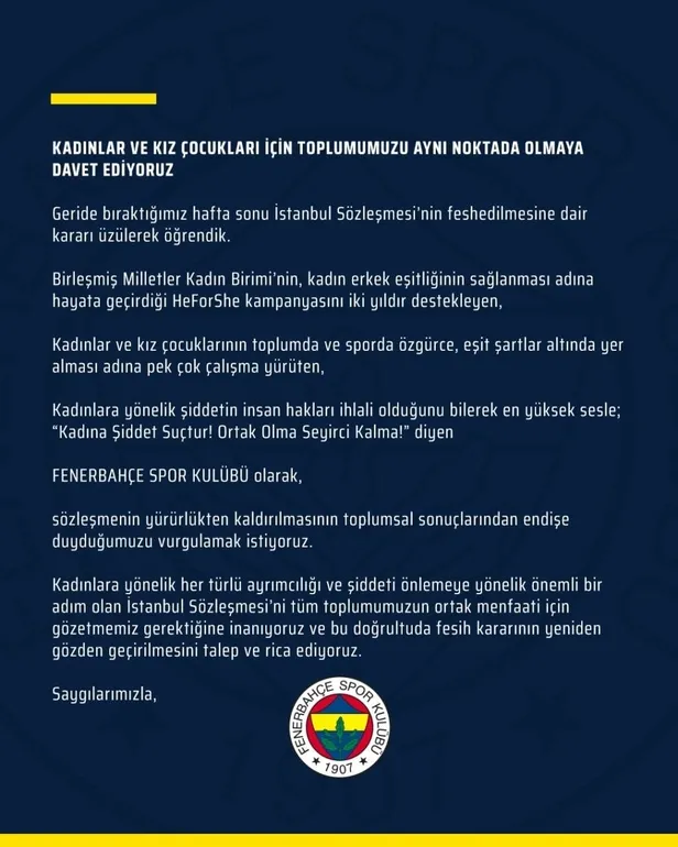 FENERBAHÇE SPOR KULÜBÜ olarak, sözleşmenin yürürlükten kaldırılmasının toplumsal sonuçlarından endişe duyduğumuzu vurgulamak istiyoruz. Kadınlara yönelik her türlü ayrımcılığı ve şiddeti önlemeye yönelik önemli bir adım olan İstanbul Sözleşmesi'ni tüm toplumumuzun ortak menfaati için gözetmemiz gerektiğine inanıyoruz ve bu doğrultuda fesih kararının yeniden gözden geçirilmesini talep ve rica ediyoruz.