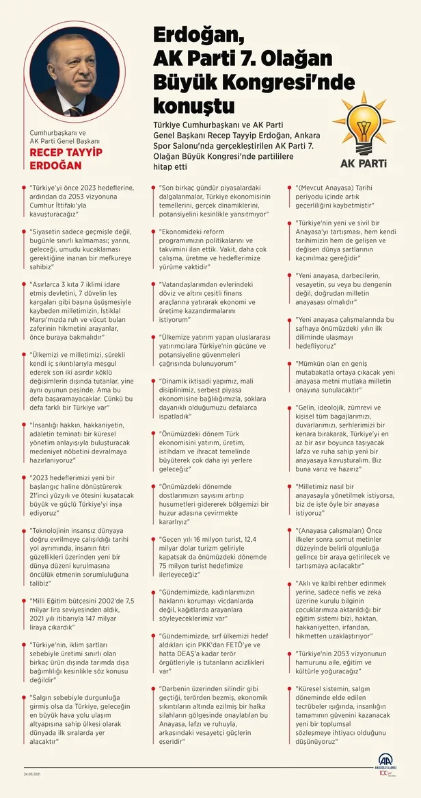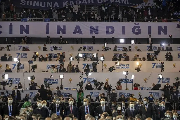 AK Parti 7. Olağan Büyük Kongresi'nde konuşan Başkan Erdoğan "Türkiye'yi önce 2023 hedefleri sonra 2053 vizyonuna Cumhur İttifakı ile inşallah kavuşturacağız." dedi. "Son bir kaç gündür piyasalarda yaşanan dalgalanmalar, Türkiye ekonomisinin temellerini, gerçek dinamiklerini, taşıdığı potansiyeli ve yarınını kesinlikle yansıtmıyor. " diyen Başkan Erdoğan, "Ekonomideki reform programımızın politikalarını ve takvimini ilan ettik. Vakit, daha çok çalışma, üretme ve hedeflerimize yürüme vaktidir. Vatandaşlarımdan evlerindeki döviz ve altını çeşitli finans araçlarına yatırarak ekonomi ve üretime kazandırmalarını istiyorum" çağrısında bulundu. Erdoğan, "Ülkemize yatırım yapan uluslararası yatırımcılara Türkiye'nin gücüne ve potansiyeline güvenmeleri çağrısında bulunuyorum." şeklinde konuştu. Erdoğan, "Gündemimizde, kadınlarımızın haklarını korumayı vicdanlarda değil, kağıtlarda arayanlara söyleyeceklerimiz var." ifadelerini kullandı. Erdoğan konuşmasının ardından oyunu da kullandı.