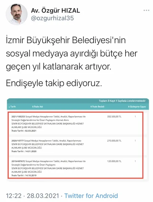 İzmir Büyükşehir Belediyesi AK Parti Grup Başkanvekili Avukat Özgür Hızal, "İzmir Büyükşehir Belediyesi'nin sosyal medyaya ayırdığı bütçe her geçen yıl katlanarak artıyor. Endişeyle takip ediyoruz" dedi.