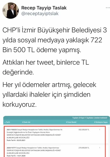 AK Parti İzmir Gençlik Kolları İl Başkanı Recep Tayyip Taslak da "CHP'li İzmir Büyükşehir Belediyesi 3 yılda sosyal medyaya yaklaşık 722 Bin 500 TL ödeme yapmış. Attıkları her tweet, binlerce TL değerinde. Her yıl ödemeler artmış, gelecek yıllardaki ihaleler için şimdiden korkuyoruz" ifadelerini kullandı.