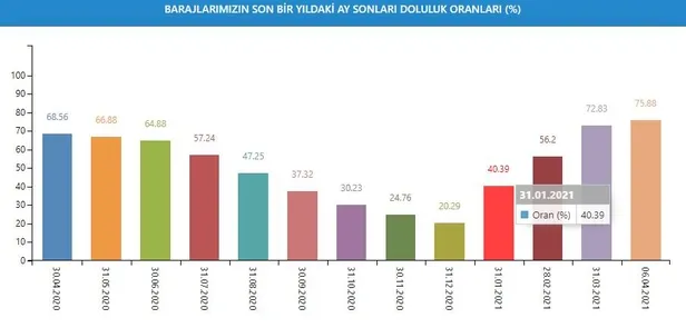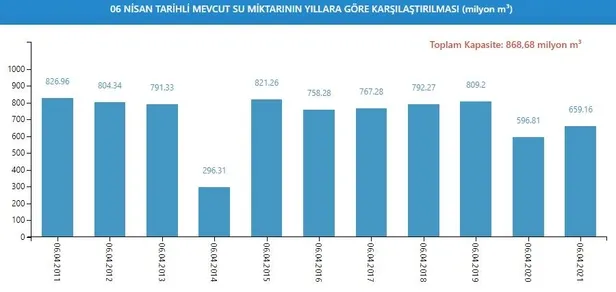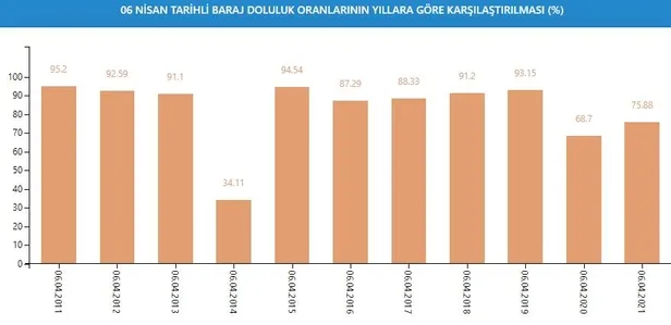 Barajlardaki doluluk oranı, 6 Nisan tarihi baz alındığında 2006'da yüzde 98,52, 2007'de yüzde 53,80, 2008'de yüzde 43,62, 2009'da yüzde 97,13, 2010'da yüzde 98,51, 2011'de yüzde 95,36, 2012'de yüzde 92,55, 2013'te yüzde 91,10, 2014'te yüzde 34,07, 2015'te yüzde 95,50, 2016'da yüzde 87,19, 2017'de yüzde 88,28, 2018'de yüzde 91,35, 2019'da yüzde 93,98, 2020'de ise yüzde 69,86 olarak gerçekleşmişti.