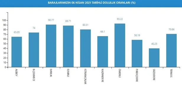 Su miktarı Istrancalar'da yüzde 80,31, Terkos'ta yüzde 70,86, Sazlıdere'de yüzde 40,25, Alibey'de yüzde 65,05, Büyükçekmece'de yüzde 74,00, Ömerli'de yüzde 93,22, Darlık'ta yüzde 90,77, Elmalı'da yüzde 88,71, Kazandere'de yüzde 66,10 ve Pabuçdere'de yüzde 58,19 olarak kaydedildi.