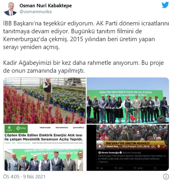Konuyla alakalı AK Parti İstanbul İl Başkanı Osman Nuri Kabaktepe de bir açıklama yaptı. İBB Başkanı'nın tüm mesaisini, AK Parti projelerini yeniden tanıtarak geçirdiğine dikkat çeken Kabaktepe, "İBB Başkanı'na teşekkür ediyorum. AK Parti dönemi icraatlarını tanıtmaya devam ediyor. Bugünkü tanıtım filmini de Kemerburgaz'da çekmiş. 2015 yılından beri üretim yapan serayı yeniden açmış. Kadir Ağabeyimizi bir kez daha rahmetle anıyorum. Bu proje de onun zamanında yapılmıştı." dedi.