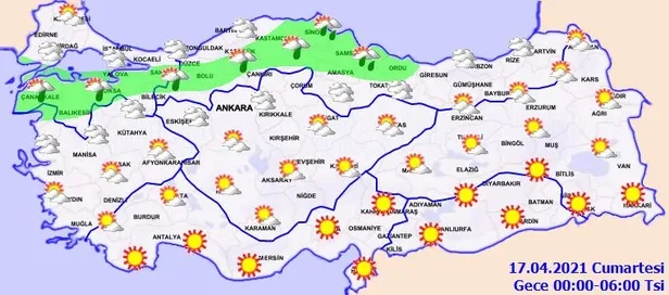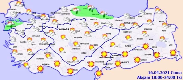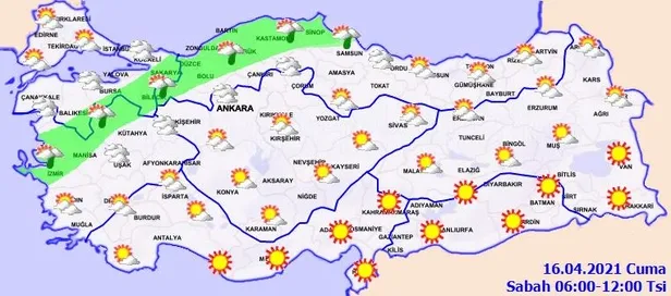 Meteoroloji Genel Müdürlüğü tarafından yapılan son değerlendirmelere göre, yurdun kuzey kesimlerinin parçalı ve yer yer çok bulutlu; Marmara'nın güneyi, Batı Karadeniz, Orta Karadeniz kıyıları, Doğu Karadeniz'in iç kesimleri ile Sakarya, İzmir, Manisa, Amasya, Erzurum, Kars ve Ardahan çevrelerinin sağanak yağışlı, diğer yerlerin az bulutlu ve açık geçeceği tahmin ediliyor. Hava sıcaklığının güney, iç ve doğu kesimlerde 2 ila 4 derece artacağı, diğer yerlerde önemli bir değişiklik olmayacağı bekleniyor. Rüzgarı genellikle güneyli, kuzeybatı kesimlerde kuzeyli yönlerden hafif, ara sıra orta kuvvette eseceği tahmin ediliyor.