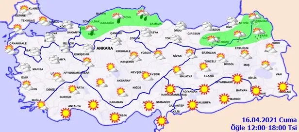 Parçalı ve çok bulutlu, öğle saatlerinden sonra Orta Karadeniz'in kıyı kesimi, Doğu Karadeniz'in iç kesimleri ile Amasya çevrelerinin sağanak yağışlı geçeceği tahmin ediliyor.