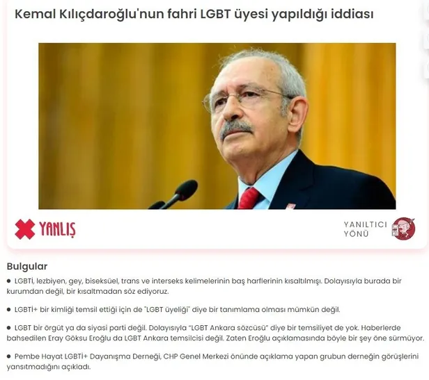 - Teyit.org'un bir başka yanıltıcı uyarısı ise "LGBTİ+ bir kimliği temsil ettiği için de "LGBT üyeliği" diye bir tanımlama olması mümkün değil." oldu. Fakat Takvim.com.tr'nin haberinde konuya ilişkin bir beyan bulunmadığı gibi, tamamen CHP Genel Merkezi önünde yaşanan gelişmeler aktarıldı. CHP liderini "fahri üye" ilan eden Takvim.com.tr değil, parti binası önünde açıklama yapanlardı.