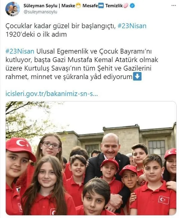 09.41: İçişleri Bakanı Süleyman Soylu da, 'Çocuklar kadar güzel bir başlangıçtı, #23Nisan 1920'deki o ilk adım