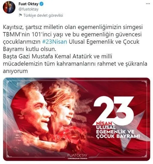 10.06: Cumhurbaşkanı Yardımcısı Fuat Oktay, 23 Nisan Ulusal Egemenlik ve Çocuk Bayramı dolayısıyla mesaj yayımladı. Oktay, sosyal medya hesabından paylaştığı mesajında şunları kaydetti: "Kayıtsız, şartsız milletin olan egemenliğimizin simgesi TBMM'nin 101'inci yaşı ve bu egemenliğin güvencesi çocuklarımızın 23 Nisan Ulusal Egemenlik ve Çocuk Bayramı kutlu olsun. Başta Gazi Mustafa Kemal Atatürk ve milli mücadelemizin tüm kahramanlarını rahmet ve şükranla anıyorum."