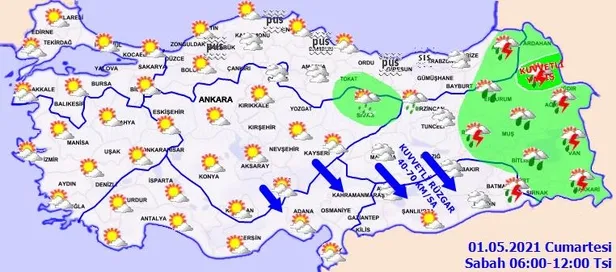 Rüzgarın genellikle kuzey ve kuzeybatı, zamanla Marmara'da batı ve güneybatı yönlerden hafif, ara sıra orta kuvvette, Doğu Akdeniz'in iç kesimleri ile Doğu Anadolu'nun güneybatısında yer yer kuvvetli (40-70 km/sa) olarak eseceği tahmin ediliyor.