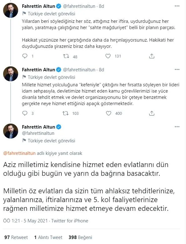 Aziz milletimiz kendisine hizmet eden evlatlarını dün olduğu gibi bugün ve yarın da bağrına basacaktır. Milletin öz evlatları da sizin tüm ahlaksız tehditlerinize, yalanlarınıza, iftiralarınıza ve 5. kol faaliyetlerinize rağmen milletimize hizmet etmeye devam edecektir.