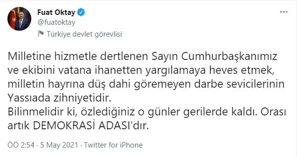Cumhurbaşkanı Yardımcısı Oktay, Twitter hesabından yaptığı açıklamada "Milletine hizmetle dertlenen Sayın Cumhurbaşkanımız ve ekibini vatana ihanetten yargılamaya heves etmek, milletin hayrına düş dahi göremeyen darbe sevicilerinin Yassıada zihniyetidir. Bilinmelidir ki, özlediğiniz o günler gerilerde kaldı. Orası artık Demokrasi Adası'dır" dedi.