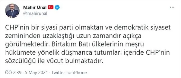 AK Parti'li Ünal, CHP'li Erdoğdu'nun Cumhurbaşkanı Erdoğan'a yönelik açıklamalarına Twitter hesabından cevap verdi. Ünal, "CHP'nin bir siyasi parti olmaktan ve demokratik siyaset zemininden uzaklaştığı uzun zamandır açıkça görülmektedir. Birtakım Batı ülkelerinin meşru hükümete yönelik düşmanca tutumları, içeride CHP'nin sözcülüğü ile vücut bulmaktadır" ifadelerini kullandı.