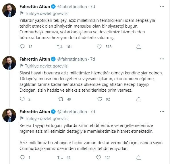Recep Tayyip Erdoğan, yıllardır sizin tehditlerinize ve engellemelerinize rağmen aziz milletimizin desteğiyle memleketimize hizmet etmektedir. Aziz milletimiz bu zihniyete hiçbir zaman destur vermediği için aslında sayın Cumhurbaşkanımız üzerinden milletimizi tehdit ediyorlar.