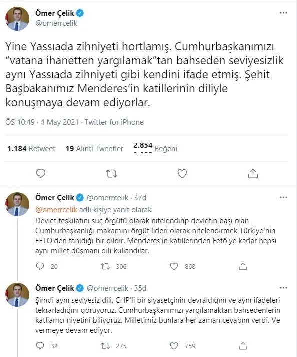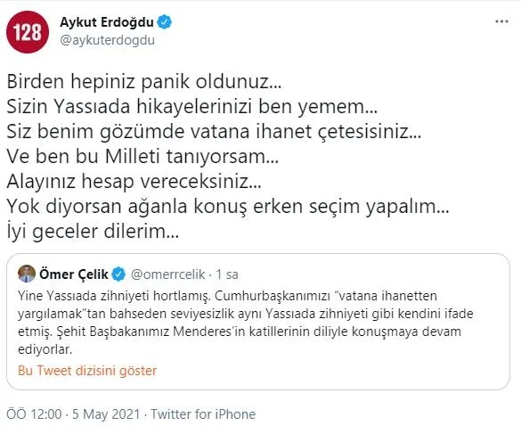 AK Parti Sözcüsü Ömer Çelik, sosyal medya hesabından yaptığı paylaşımda Başkan Recep Tayyip Erdoğan'ı "vatana ihanetten" yargılayacaklarını açıklayarak darbe imasında bulunan CHP'li Aykut Erdoğdu'ya çok sert tepki gösterdi. Çelik, "Yine Yassıada zihniyeti hortlamış. Menderes’in katillerinin diliyle konuşmaya devam ediyorlar" dedi. İletişim Başkanı Fahrettin Altun da "Recep Tayyip Erdoğan, sizin hadsiz ve ahlaksız tehditlerinize prim vermez" ifadeleriyle tepkisini dile getirdi.