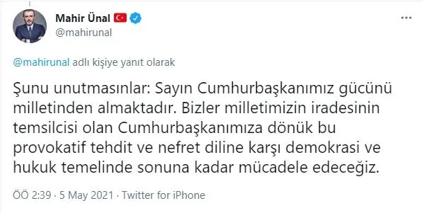 "Bu zihniyete 15 Temmuz gecesi haddini bildirmiştik ancak belli ki hala akıllanmamışlar. Cumhurbaşkanımız Sayın Recep Tayyip Erdoğan'ın hukuku bu milletin hukukudur ve biz, liderimizin de milletimizin de hukukunu asla çiğnetmeyiz.