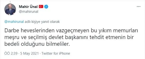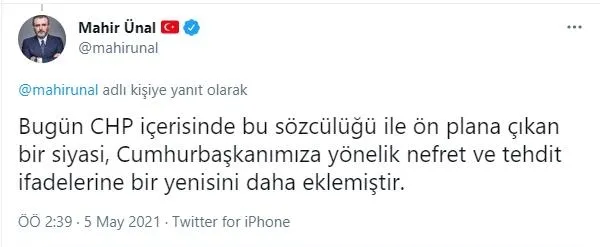 Ünal, Erdoğdu'nun açıklamalarını eleştirerek, "Bugün CHP içerisinde bu sözcülüğü ile ön plana çıkan bir siyasi, Cumhurbaşkanımıza yönelik nefret ve tehdit ifadelerine bir yenisini daha eklemiştir. Darbe heveslerinden vazgeçmeyen bu yıkım memurları meşru ve seçilmiş devlet başkanını tehdit etmenin bir bedeli olduğunu bilmeliler. Şunu unutmasınlar: Sayın Cumhurbaşkanımız gücünü milletinden almaktadır. Bizler milletimizin iradesinin temsilcisi olan Cumhurbaşkanımıza dönük bu provokatif tehdit ve nefret diline karşı demokrasi ve hukuk temelinde sonuna kadar mücadele edeceğiz" dedi.