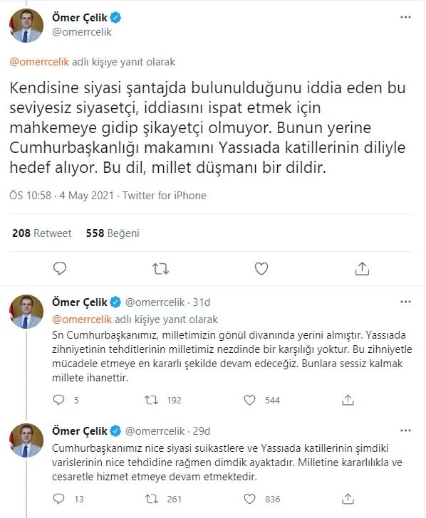 Erdoğdu'nun kullandığı dili FETÖ'den tanıdıklarını vurgulayan Çelik, "Menderes'in katillerinden FETÖ'ye kadar hepsi aynı millet düşmanı dili kullandılar. Şimdi aynı seviyesiz dili, CHP'li bir siyasetçinin devraldığını ve aynı ifadeleri tekrarladığını görüyoruz. Cumhurbaşkanımızı yargılamaktan bahsedenlerin katliamcı niyetini biliyoruz. Milletimiz bunlara her zaman cevabını verdi. Ve vermeye devam ediyor." dedi.