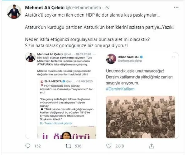 İzmir Milletvekili Mehmet Ali Çelebi: "Atatürk'ü soykırımcı ilan eden HDP ile dar alanda kısa paslaşmalar... Atatürk'ün kurduğu partiden Atatürk'ün kemiklerini sızlatan partiye...Yazık! Neden istifa ettiğimizi sorgulayanlar bunlara alet mi olacaktık? Sizin hata olarak gördüğünüze biz omurga diyoruz!"