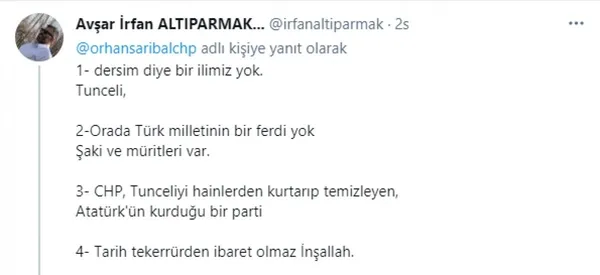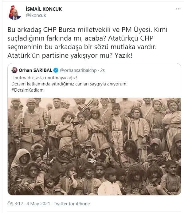 CHP Bursa Milletvekili ve Parti Meclisi Üyesi Orhan Sarıbal, Dersim olaylarıyla ilgili sosyal medya hesabından tartışma yaratan bir paylaşım yaptı.