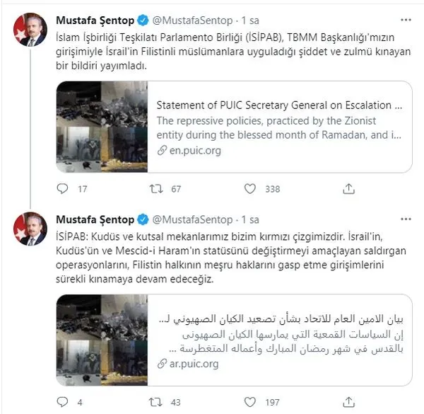 TBMM Başkanı Mustafa Şentop, bugün Sivas'ta yaptığı açıklamada, "İSİPAB'ın Mescid-i Aksa'ya yapılan saldırı ile ilgili parlamentolar arası gerekli şiddette, dozajda, bir açıklama yapmasını, bir tavır almasını arzu ediyoruz. Bu konuyla ilgili teklifimizi, önerimizi sekretaryasına bildirdik. Bununla ilgili bir çalışma yürütülüyor." demişti