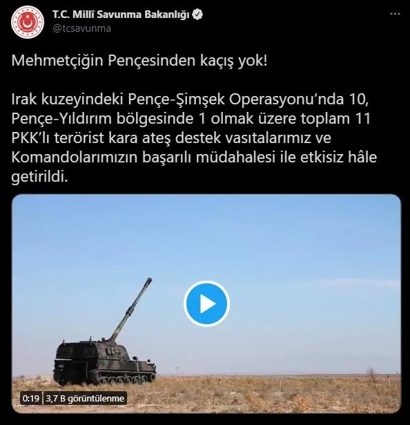 Irak kuzeyindeki Pençe-Şimşek Operasyonu'nda 10, Pençe-Yıldırım bölgesinde 1 olmak üzere toplam 11 PKK'lı terörist kara ateş destek vasıtalarımız ve Komandolarımızın başarılı müdahalesi ile etkisiz hâle getirildi." ifadelerine yer verildi.