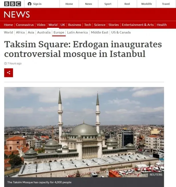 BBC: "Erdoğan, İstanbul Taksim Meydanı'ndaki tartışmalı caminin açılışını yaptı. Camii, laik Türk cumhuriyetinin sembolü olarak görülen bir kamusal alanın yanında belirgin bir şekilde öne çıkıyor."