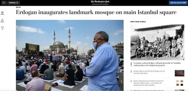 Washington Post: "Türkiye Cumhurbaşkanı Recep Tayyip Erdoğan cuma günü, İstanbul'un Taksim Meydanı'nda, modern Türkiye Cumhuriyeti'nin sembolü haline gelen "bir Müslüman ibadethanesi inşa etme arzusu"nu yerine getiren yeni bir caminin açılışını yaptı. Camiinin yapıldığı yer; 2013'te hükümetin bitişikteki Gezi Parkı'ndaki inşaat planlarının ateşlediği kitlesel hükümet karşıtı protestoların da yapıldığı meydan...