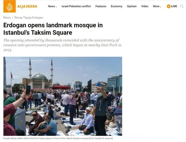 Al Jazeera: "Erdoğan, İstanbul'un Taksim Meydanı'nda cami açtı. Binlerce kişinin katıldığı açılış, 2013 yılında Gezi Parkı yakınlarında başlayan hükümet karşıtı kitlesel protestoların yıl dönümüne denk geldi."