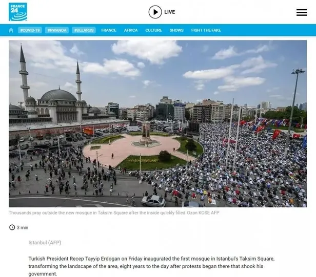 France24: "Türkiye Cumhurbaşkanı Recep Tayyip Erdoğan, İstanbul Taksim Meydanı'ndaki caminin açılışını yaparak, hükümetini sarsan protestoların başlamasından 8 yıl sonra bölgenin manzarasını değiştirdi."