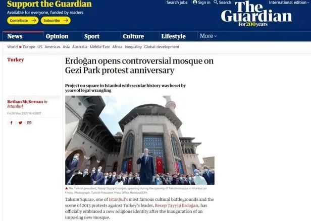 The Guardian: "Erdoğan, Gezi Parkı protestolarının yıl dönümünde İstanbul'da laik tarihe sahip meydandaki tartışmalı camiyi açtı. Modern şehrin kalbindeki ibadethane, yaklaşık 20 yıldır Atatürk'ün laik mirasını yıkmak için çalışan ve Türkiye'ye kendi damgasını vuran dindar Erdoğan için uzun zamandır bir hayaldi."