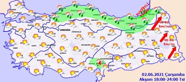 Meteoroloji Genel Müdürlüğü tarafından yapılan son değerlendirmelere göre, ülkemizin kuzey ve iç kesimlerinin parçalı ve çok bulutlu, Marmara'nın doğusu, Doğu Akdeniz, İç Anadolu ve Karadeniz ile Balıkesir, Kütahya, Afyonkarahisar, Erzincan ve Ardahan çevrelerinin aralıklı sağanak ve gök gürültülü sağanak yağışlı geçeceği tahmin ediliyor. Yağışların; öğle saatlerinde Orta Karadeniz'in iç kesimleri, Doğu Karadeniz kıyıları ile Düzce, Zonguldak, Bartın, Adana ve Mersin'in kuzey, Kahramanmaraş'ın batı ilçelerinde yerel olarak kuvvetli olması bekleniyor.