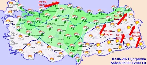 Genellikle batı ve güney, zamanla kuzeybatı kesimlerde kuzeybatı yönlerden hafif ara sıra orta kuvvette, Batı Karadeniz kıyıları, İç Anadolu'nun doğusu, Doğu Anadolu, Güneydoğu Anadolu'nun kuzey ve doğusunda kuvvetli ve kısa süreli fırtına (40-70 km/sa), Doğu Anadolu'nun güneydoğusunda yer yer kuvvetli fırtına (60-80 km/sa) şeklinde esmesi bekleniyor.