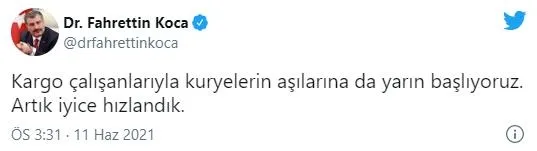 Sağlık Bakanı Fahrettin Koca, kargo çalışanlarıyla kuryelerin aşılanmasına başlandığını açıkladı. "Artık iyice hızlandık" mesajını paylaştı.