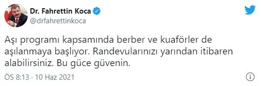 Bakan Koca, aşı programı kapsamında berber ve kuaförler de aşılanmaya başlanacağını açıklamıştı. Dünden itibaren kuaför ve berberlerin de aşılaması başladı.